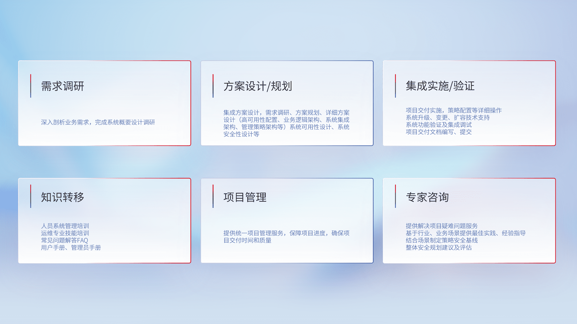 针对客户行业特性,,,,将宏观的安全战略和需求,,通过专业的交付服务,,实现项目落地,,,为客户提供标准规范的集成交付服务。。